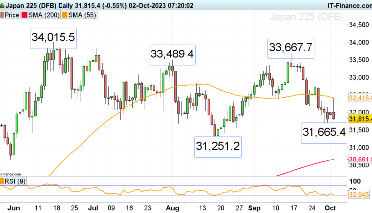 Immediate resistance sits around the 32,000 mark and further minor resistance at the 22 September low at 32,167.9, followed by the mid-September low and the 55-day SMA at 32,396.5 to 32,415.7.