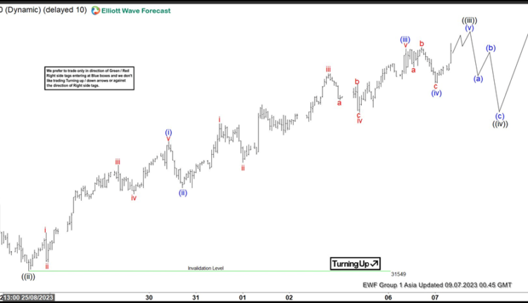 Pullback in wave (ii) ended at 32200 and the Index then resumed higher in wave (iii) towards 33280. Dips in wave (iv) ended at 33015 as expanded flat. Expect the Index to end wave (v) of ((iii)) soon. Afterwards, it should pullback in wave ((iv)) to correct cycle from August 25 low before the rally resumes. Typically wave ((iv)) should pullback somewhere around 23.6 – 38.2 Fibonacci retracement of wave ((iii)). Near term, as far as pivot at 31549 low stays intact, expect wave ((iv)) pullback to find support in 3, 7, 11 swing for more upside in wave ((v)).