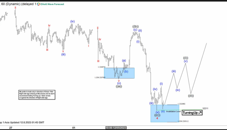 Corrective rally in wave ((b)) unfolded as a zigzag structure. Up from wave ((a)), wave (a) ended at 32975 and pullback in wave (b) ended at 32850. Final leg wave (c) ended at 33465 which completed wave ((b)). The Index then extended lower in wave ((c)) as a 5 waves impulse. Down from wave ((b)), wave (i) ended at 33335 and wave (ii) ended at 33430. Wave (iii) lower ended at 32350 and wave (iv) ended at 32505. Final leg wave (v) ended at 32211 which completed wave ((c)) of 4. Wave 5 higher is currently in progress. As far as pivot at 32211 low stays intact, expect the Index to extend higher. Break below 32211 from here suggests the Index is still in the process of ending wave 4.