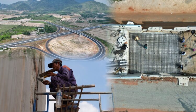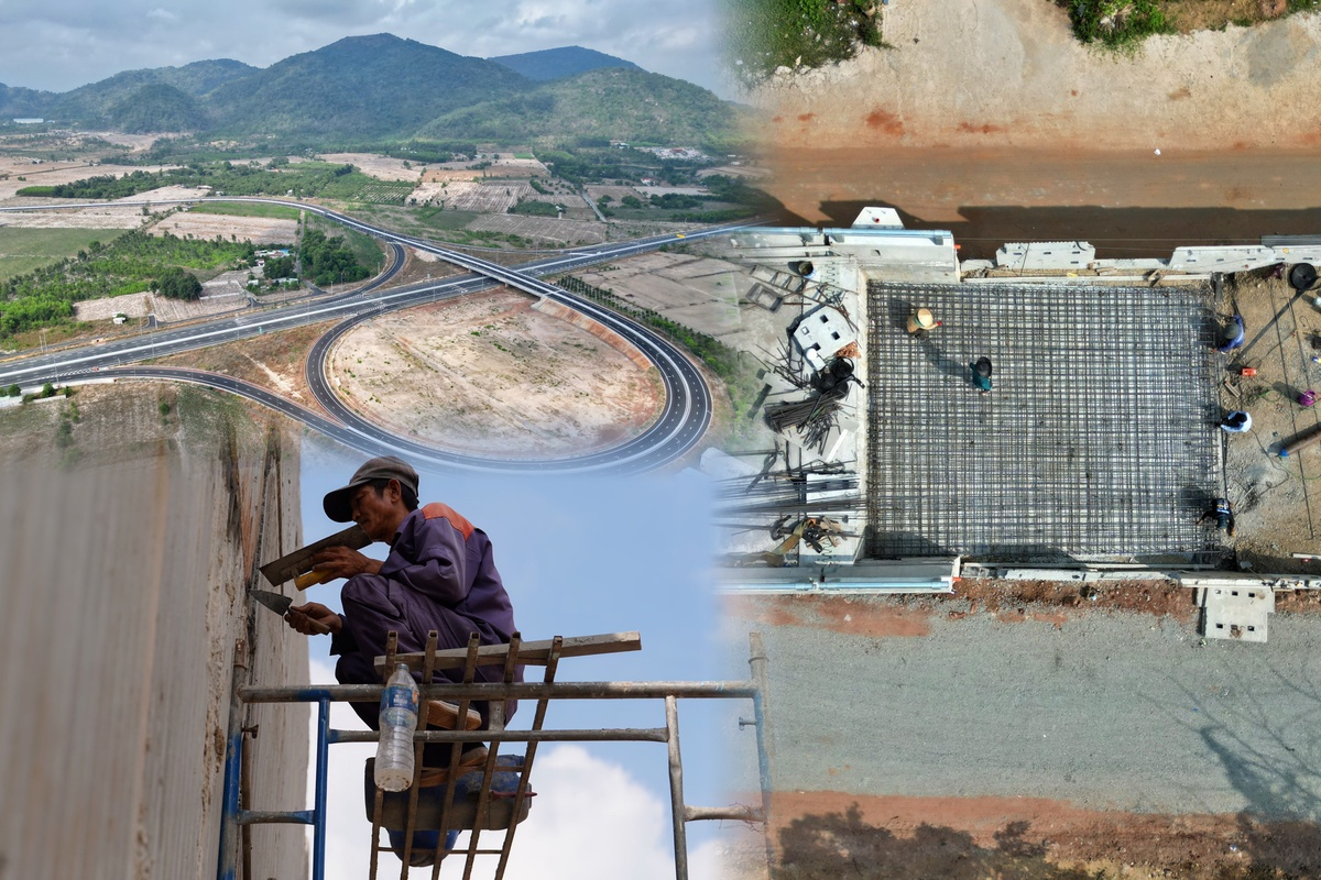 Công nhân đội nắng làm việc xuyên trưa tại cầu vượt ngang tại Km46.