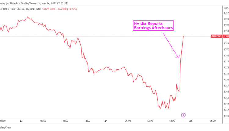 During after-hours trade, Nvidia’s stock soared over 25 percent, producing a rippling effect for the tech-heavy Nasdaq 100 (futures) and to a certain extent, the S&P 500 too – see chart below. As a result, Wall Street reversed a good chunk of losses seen during Wednesday’s trading session, which saw the Nasdaq Composite drop 0.61%.
