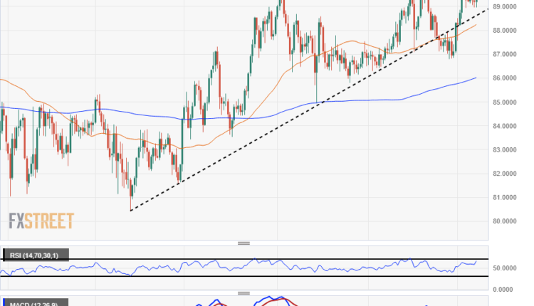 Intraday technical support sits at the top of the last swing high near 89.50, with dynamic support from the 200-hour Simple Moving Average (SMA) sitting just south of 89.30.