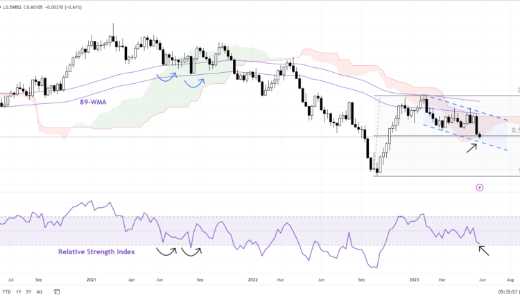 NZD/USD is testing vital converged support on the lower edge of a declining channel from February and a 50% retracement of the October 2022-February 2023 rise. In general, 38%-50% retracements are considered to be reasonable, and not necessarily the end of the prior trend (uptrend in this case). Moreover, the pair late last year was able to retrace 100% of the August 2022-October 2022 slide – often a sign that bears are exhausted. Still, a break above the May high of 0.6385 is needed for the downside risks to fade.