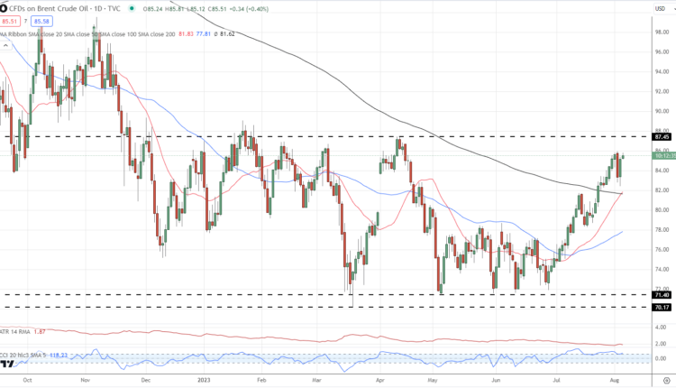 Brent oil remains in a multi-week bullish channel and is a couple of dollars away from levels last seen in early April this year. Ongoing oil demand is pushing the price higher as fears of a recession in the US continue to fade. The daily chart also shows a bullish 20-day/200-day simple moving average crossover, driven by the sharp move higher in the shorter-dated average, while the CCI indicator suggests that the market is overbought, but not excessively. Short-term support is seen between $81.60/bbl. and $82.50/bbl.