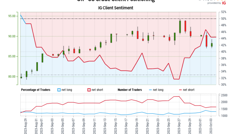 Oil – US Crude IG Client Sentiment: Our data shows traders are now net-long Oil – US Crude for the first time since Aug 30, 2023 when Oil
