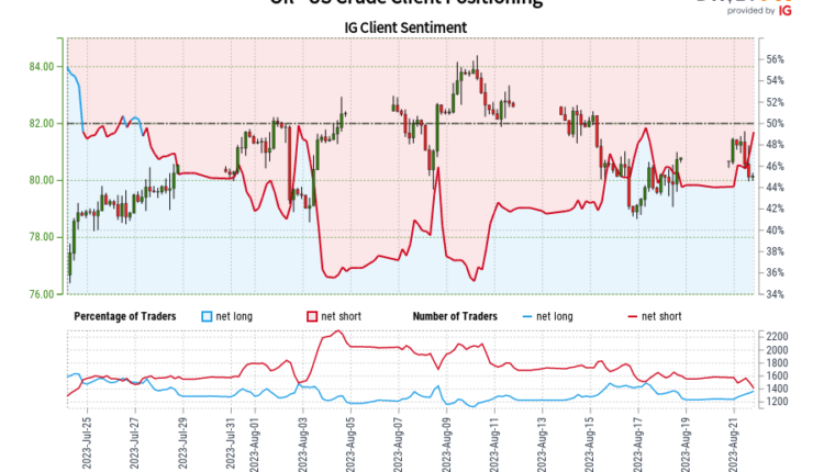 Oil – US Crude IG Client Sentiment: Our data shows traders are now net-long Oil – US Crude for the first time since Jul 27, 2023 when Oil