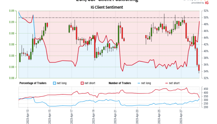 Our data shows traders are now net-long EUR/GBP for the first time since Apr 13, 2023 when EUR/GBP traded near 0.88.