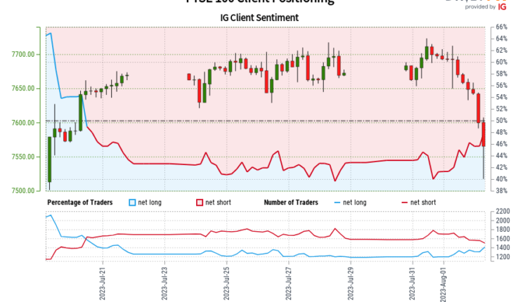 Our data shows traders are now net-long FTSE 100 for the first time since Jul 20, 2023 when FTSE 100 traded near 7,644.70.
