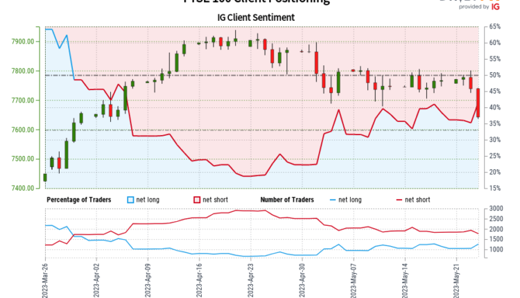 Our data shows traders are now net-long FTSE 100 for the first time since Mar 30, 2023 when FTSE 100 traded near 7,622.50.