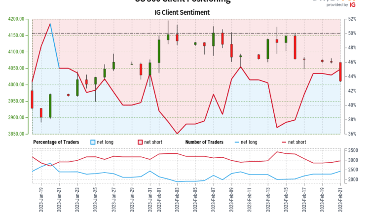 Our data shows traders are now net-long US 500 for the first time since Jan 20, 2023 when US 500 traded near 3,970.24. Traders are further net-long than yesterday and last week, and the combination of current sentiment and recent changes gives us a stronger US 500-bearish contrarian trading bias.