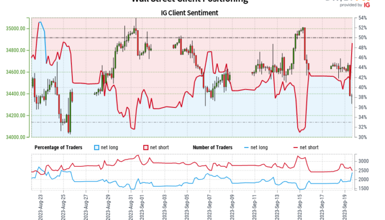 Our data shows traders are now net-long Wall Street for the first time since Aug 24, 2023 when Wall Street traded near 34,133.90.