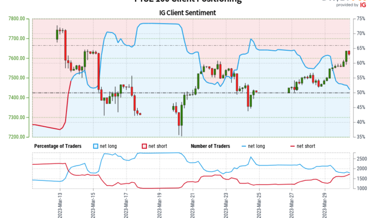 Our data shows traders are now net-short FTSE 100 for the first time since Mar 13, 2023 when FTSE 100 traded near 7,543.90.