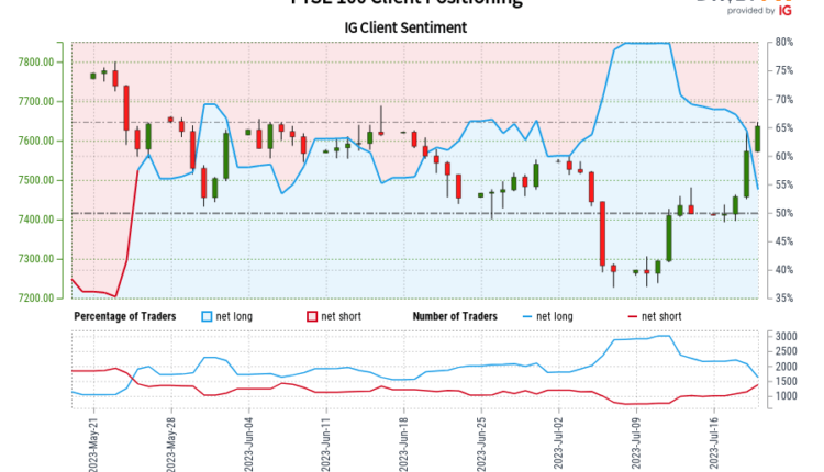 Our data shows traders are now net-short FTSE 100 for the first time since May 24, 2023 when FTSE 100 traded near 7,626.60.