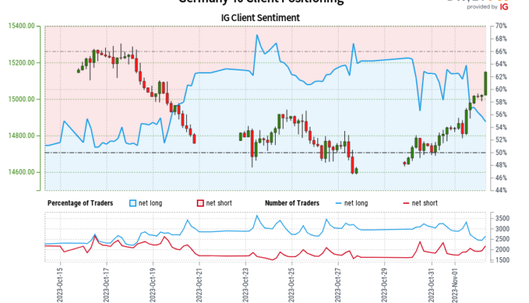 Our data shows traders are now net-short Germany 40 for the first time since Oct 16, 2023 when Germany 40 traded near 15,241.50.