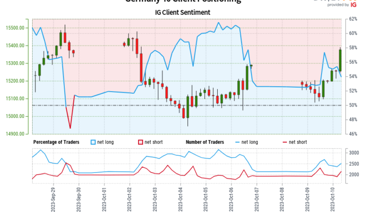 Our data shows traders are now net-short Germany 40 for the first time since Sep 29, 2023 when Germany 40 traded near 15,356.80.