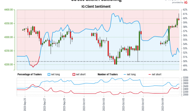 Our data shows traders are now net-short US 500 for the first time since Sep 26, 2023 when US 500 traded near 4,277.54. Traders are further net-short than yesterday and last week, and the combination of current sentiment and recent changes gives us a stronger US 500-bullish contrarian trading bias.