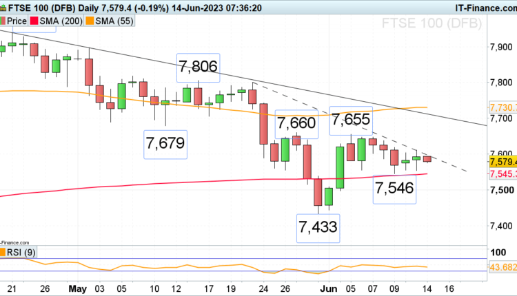 The technical levels to watch for a potential break out of the range are Tuesday’s 7,611 high and last week’s 7,546 low and the 200-day simple moving average (SMA) at 7,545. While Friday’s low at 7,546 underpins, the late May and current June highs at 7,655 to 7,660 may still be reached.