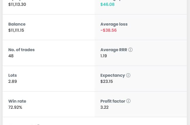 In this screenshot you can see the trades statistics. Average RRR = 1:19, Win rate = 72.92 %, Profit factor = 3.22, and Sharp ratio = 1.37.