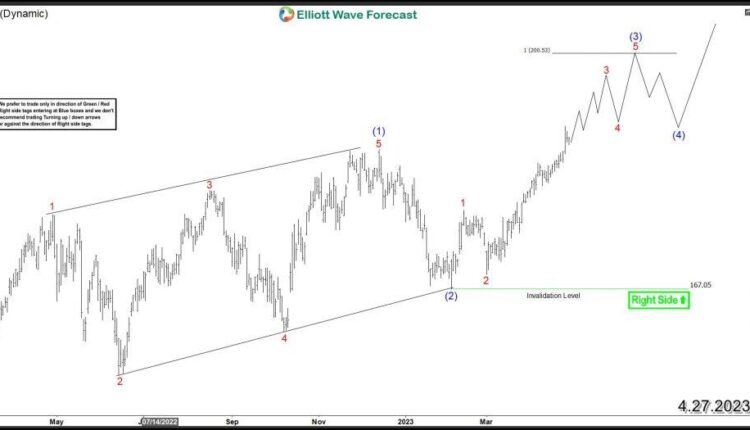 The rally from March 2022 low unfolded as a leading diagonal in wave (1) at $186.84, followed by a pullback in wave (2) ended at $167.05. Ideally, the move higher in wave (3) should target the 100% Fibonacci extension area at $200.53, followed by a potential 3-wave pullback before resuming the rally. Additionally, the 123.6% – 161.8% Fibonacci extension levels, located at $208 – $221, may come into play at a later stage of the cycle. In conclusion, PEP’s Elliott Wave patterns suggest that the stock is in a bullish sequence from March 2022 low, with the wave (3) in progress. Any pullbacks in 3, 7, or 11 swings should be seen as potential buying opportunities, as long as the stock remains supported above the wave (2) low of $167.05.