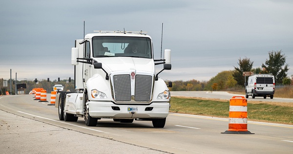 Một chiếc xe tải hạng nặng Cummins chạy điện đang sạc khi chạy trên đoạn đường thử nghiệm trên Quốc lộ 52/Quốc lộ 231 ở West Lafayette. Nguồn: Ảnh của Đại học Purdue/Kelsey Lefever