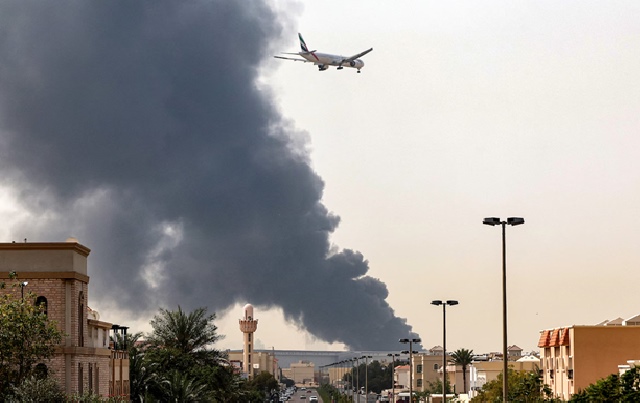 Một máy bay của hãng hàng không Emirates chuẩn bị hạ cánh khi khói đen đang bốc lên cạnh sân bay quốc tế Dubai, ngày 30/3/2026. Ảnh: AFP, Getty Images.