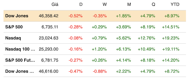 Kết thúc phiên giao dịch ngày 09/10, chỉ số S&P 500 lùi 0.28% xuống 6,735.11 điểm, còn chỉ số Nasdaq Composite hạ 0.08% xuống 23,024.63 điểm. Tại mức đỉnh trong phiên, S&P 500 tiến 0.2% và Nasdaq Composite nhích 0.1%. Chỉ số Dow Jones mất 243.36 điểm (tương đương 0.52%) còn 46,358.42 điểm.