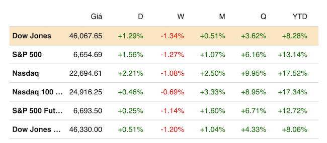 Kết thúc phiên giao dịch ngày 13/10, chỉ số Dow Jones tăng 587.98 điểm (tương đương 1.29%) lên 46,067.58 điểm, lấy lại 67% những gì đã mất trong ngày 10/10. Chỉ số S&P 500 tiến 1.56% lên 6,654.72 điểm, lấy lại 56% mức giảm trước đó. Chỉ số Nasdaq Composite cộng 2.21% lên 22,694.61 điểm, do cổ phiếu công nghệ dẫn đầu đà phục hồi.