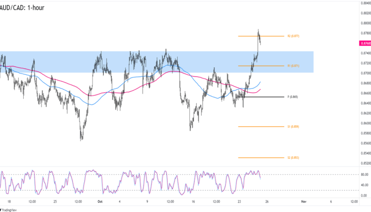 Keep an eye on how AUD/CAD reacts to the .8750 psychological level or R1 (.8710) potential support zones to see if there’s enough buying interest before and after the BOC’s decision.
