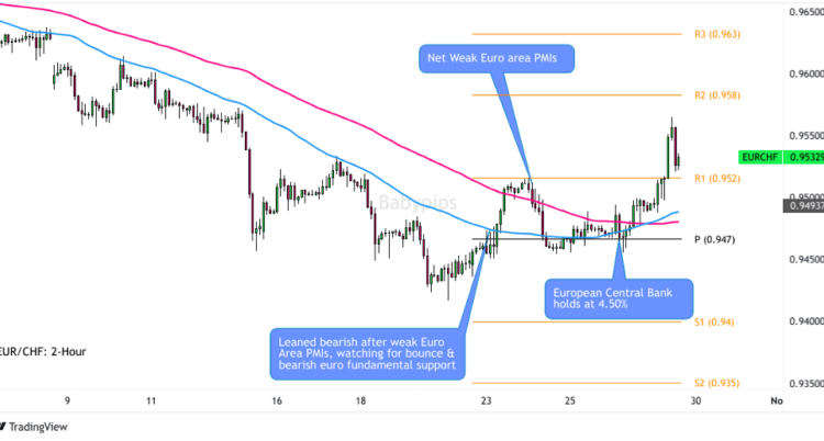 But the bears pounced on EUR/CHF quickly after another round of weaker-than-expected flash PMIs from the Euro area, prompting a swift move from the R1 pivot area to the pivot point.