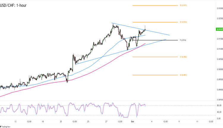 This is probably why USD/CHF is breaking above a trend line resistance in the 1-hour time frame. As you can see, the trend line also marks the top of a bullish pennant-type consolidation.