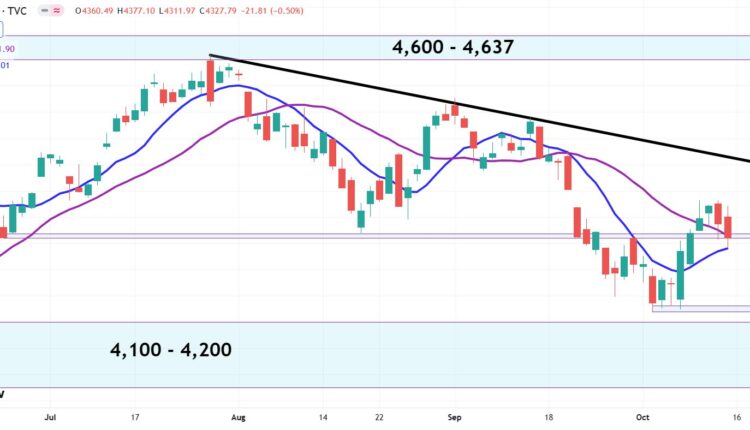 The S&P 500 closed last Friday near support at 4,328 – a support level that stems from the low on June 26. A break here would send the index down to the new support level created two weeks ago (early October) between 4,216 and 4,225. This little window appears significant as it halted downward price action four sessions in a row.