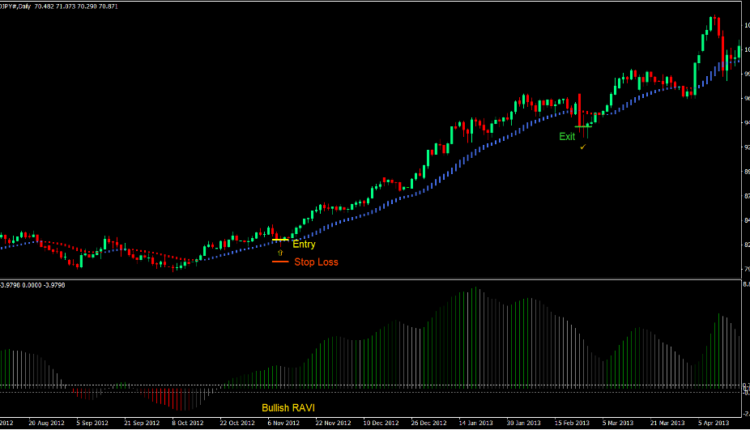 First, trend direction is identified based on the color of the HAMA bars. Such trend direction is then confirmed based on the rising or dropping swing point pattern of price action. The RAVI bars should also confirm the trend direction based on whether the bars are generally positive or negative. Trades are taken exclusively in the direction of the trend.