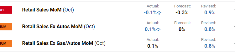 US retail sales broke its run of six consecutive positive prints in October, dropping 0.1% in the month of October compared to September. In addition, September’s number was revised higher from +0.7% to +0.9%.
