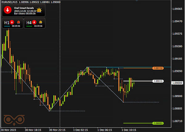 For convenience and timely receipt of signals I use the Owl Smart Levels Indicator. The main trading timeframe is M15, while the H1 and H4 timeframes are used to confirm the trend direction of the higher timeframe.