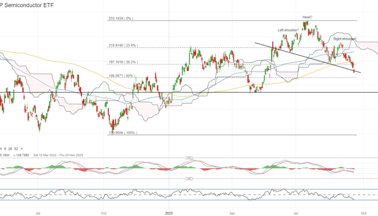 Major US indices are finding themselves at a critical juncture, with the S&P 500 back to retest a key support at the 4,330 level. Similarly, the Nasdaq 100 faces a key test for dip-buyers at the 14,680 level. Rate-sensitive growth sectors have been bearing a greater brunt of the sell-off lately, with the SPDR S&P Semiconductor ETF seemingly breaking below its neckline of a head-and-shoulder formation on the daily chart. There is still the potential for a bullish divergence to be formed on the daily relative strength index (RSI), provided that the index turned higher over coming days, but the neckline resistance will have to be reclaimed. Failure to do so may leave the May 2023 low on watch for a retest at the 174.00 level.