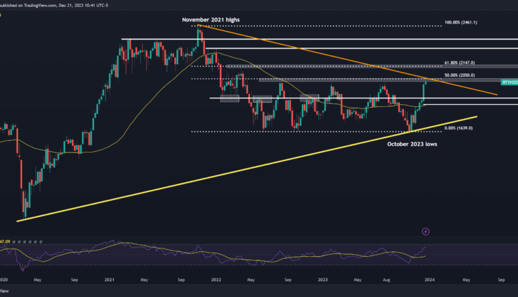 On the flip side, if the bears regain control of the market and spark a reversal lower, the Russell 2000 may gravitate towards the psychological 1,900 level. While the small-cap index could find stability in this area before resuming its upward trajectory, a breakdown could pave the way for a more significant retreat, with the 50-week simple moving average at 1,850 acting as the next floor.