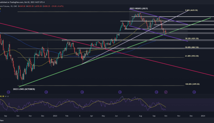 From a technical standpoint, the S&P 500 has descended towards trendline support at 4,300 after its recent retrenchment. If buyers are unable to counteract the downward pressure and this floor gives way, the equity benchmark could decline towards the lower boundary of a short-term descending channel at 4,265. On further weakness, the focus shifts to the 200-day simple moving average.