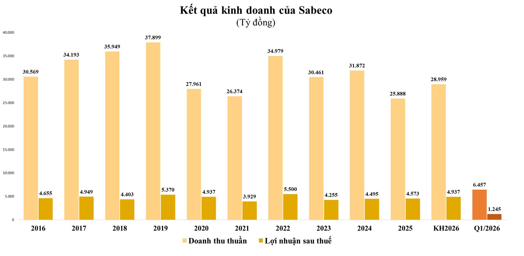 Năm 2026, Sabeco đặt mục tiêu đạt doanh thu thuần 28.959 tỷ đồng, lợi nhuận sau thuế 4.937 tỷ đồng. Như vậy, kết thúc quý I, doanh nghiệp đã hoàn thành khoảng 22% kế hoạch doanh thu và 25% mục tiêu lợi nhuận sau thuế cả năm đề ra.