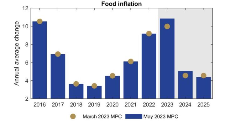 Food price inflation is revised up again, in part due to the lagged impact of the weaker exchange rate and despite global food prices falling in dollar terms. Food price inflation is now expected to be 10.8% in 2023 (up from 9.9%) and 5.0% in 2024 (up from 4.5%). Despite the Governors comments we have heard from the ECB this week who are also battling and concerned about rising food prices with the UK s PM Sunak and Chancellor Hunt following a similar rhetoric. Headline inflation for 2023 is revised up to 6.2% (from 6.0%) with headline inflation for 2024 also increased to 5.1%, before moderating to 4.5% in 2025 on the back of easing food and fuel inflation.