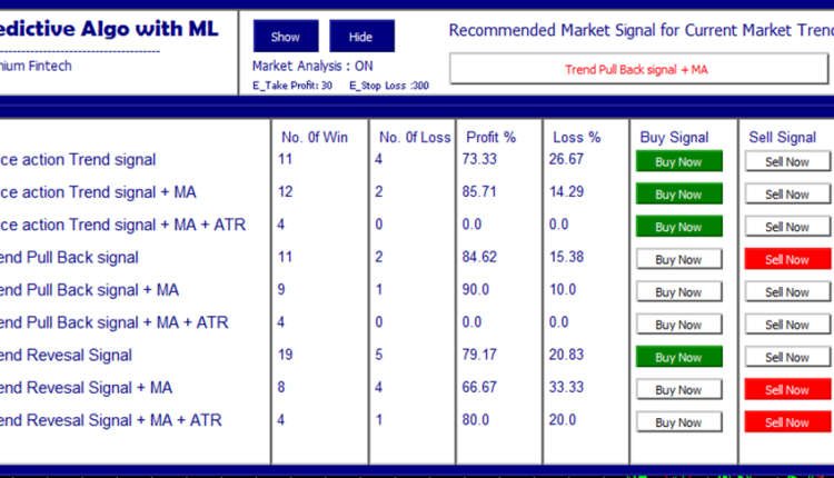 When Signals are detected, Predictive Algo uses a machine learning algorithm which simulates trade orders and records win and loss rates, percentage gain and percentage loss. These data are used to estimate the success of these signals, and a machine learning model is trained to evaluate the most prevalent and profitable signal in the market and displayed it on the ultra-show display panel. Email notifications are also sent to traders when trade signals are confirmed.