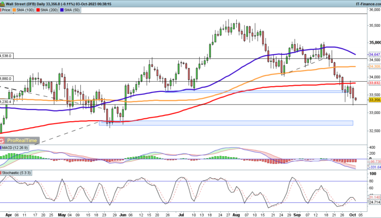 The index touched a four-month low in Monday’s session and has shown no sign yet of forming a low. Friday’s rejection of the 200-day simple moving average (SMA) provided a fresh bearish catalyst, and for now, further declines seem likely. A drop below 33,230 would mark a new bearish move and open the way to the 32,700 level that was last tested in May.