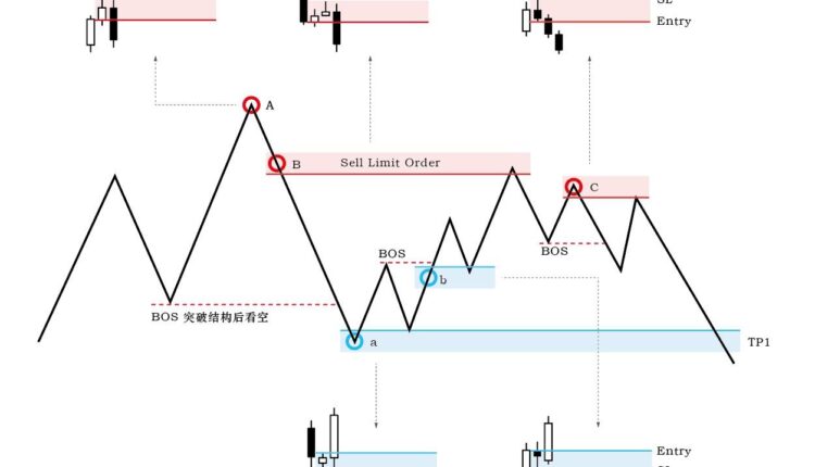 • Point a is the first target of the limit short order at point B, where some profits will be locked by reducing the position, and point C is the second entry point for the short position.