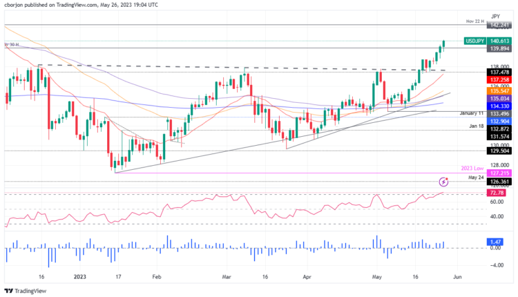 USD/JPY rallied sharply past the 140.00 figure on Friday late in the New York session, after traveling towards its daily low of 139.49, before making a U-turn. Solid economic data from the United States (US) bolstered the odds for another rate hike by the Federal Reserve (Fed), as shown by the market reaction. US Treasury bond yields rose before reversing their course, while the US Dollar weakened. At the time of writing, the USD/JPY is trading at 140.60.