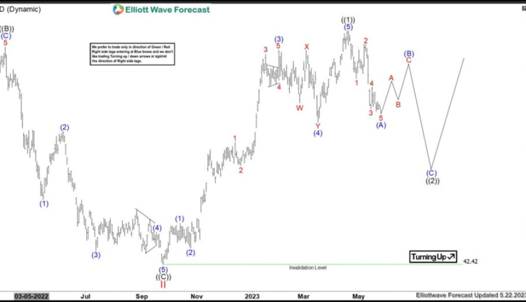 It placed I at $83.15 high & II at $42.42 low as flat correction in weekly sequence. Above there, it favors higher in wave (1) of ((3)) of III. It placed (1) of ((1)) at $49.41 high & (2) at $45.17 low. It extended higher in (3), which ended at $78.76 high & placed (4) at $66.47 low as 0.32 Fibonacci retracement. Finally, it ended (5) at $82.05 high as ((1)). It corrected lower in ((2)) as zigzag correction, which ended at $64.66 low.