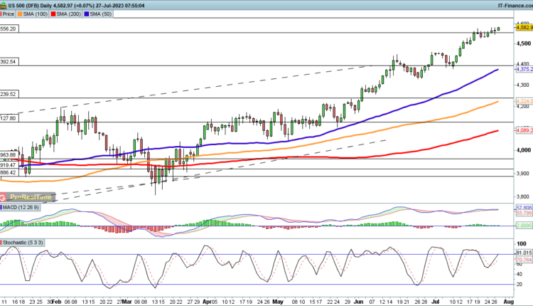 ​While the price may look overextended in the short term, so far there is little sign of any substantive turn lower. For this to happen we would need a drop back below 4500, and then a move to the 4400 support level or the 50-day SMA might come into view.