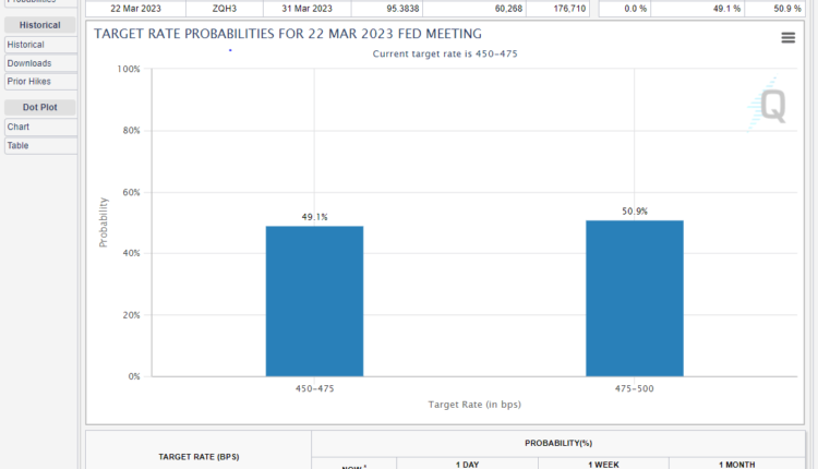 In any case, we’ll hear more from the FOMC next week when it announces its March decision. Expectations are in a flux, but pricing suggests 51% odds of a quarter-point hike versus a 49% chance of no move at all. See FedWatch tool chart below for clarification.