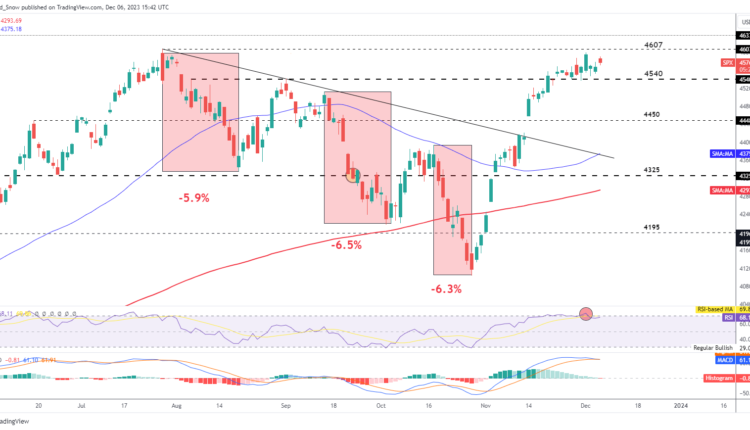 The S&P 500 may soon witness a slight slowdown as the current (mature) bullish advance risks overheating. US equities have continued to build on prior gains as markets defiantly price in a greater number of 2024 rate hikes which are now anticipated to start in May next year, up from June. With markets being forward-looking in nature, rate cuts bode well for stocks as a lower future interest rate props up the current value of stock prices.