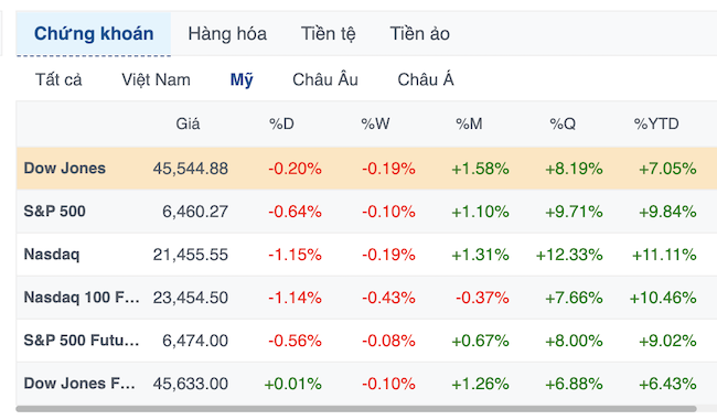 Kết thúc phiên giao dịch ngày 29/08, chỉ số S&P 500 lùi 0.64% xuống 6,460.26 điểm, nhưng vẫn ghi nhận tháng tăng thứ 4 liên tiếp. Chỉ số Nasdaq Composite mất 1.15% còn 21,455.55 điểm, còn chỉ số Dow Jones giảm 92.02 điểm (tương đương 0.20%) xuống 45,544.88 điểm.