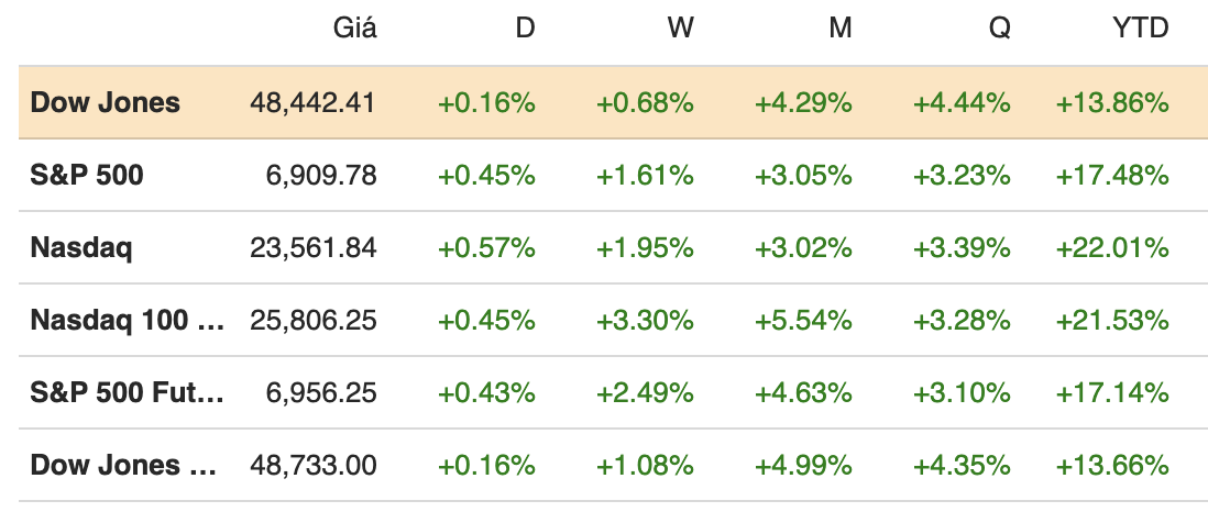 Khép phiên ngày 23/12, chỉ số S&P 500 tăng 0.46%, đóng cửa ở mức kỷ lục 6,909.79 điểm. Nasdaq Composite tăng 0.57%, chốt phiên tại 23,561.84 điểm, nhờ đà tăng của các “ông lớn” công nghệ như Nvidia và Broadcom, lần lượt tăng khoảng 3% và hơn 2%. Trong khi đó, Dow Jones Industrial Average tăng 79.73 điểm, tương đương 0.16%, lên 48,442.41 điểm.