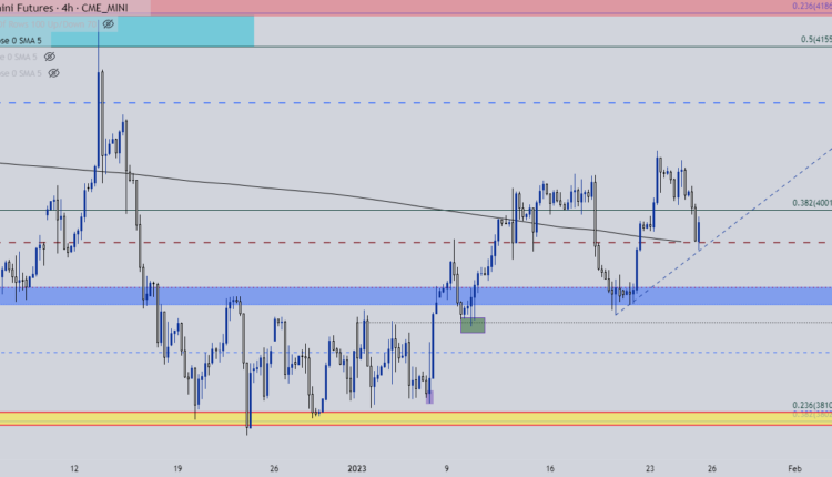 The S&P 500 started this week by pushing up to a fresh monthly high on Monday but, since then, bulls haven’t been able to do much. Yesterday’s daily candle in S&P 500 futures printed as a doji and an inside bar and in early trade this morning, prices have continued to pull back, with support showing around a familiar spot at 3970.